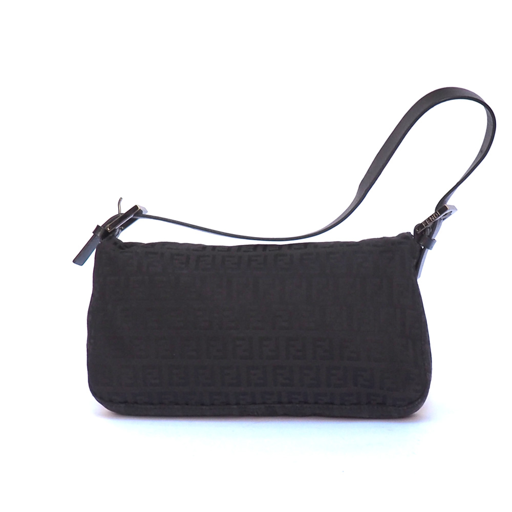Borsa originale Fendi Baguette Zucchino in tela jacquard nera, interno in tessuto con tasca con zip. Hardware color canna di fucile.