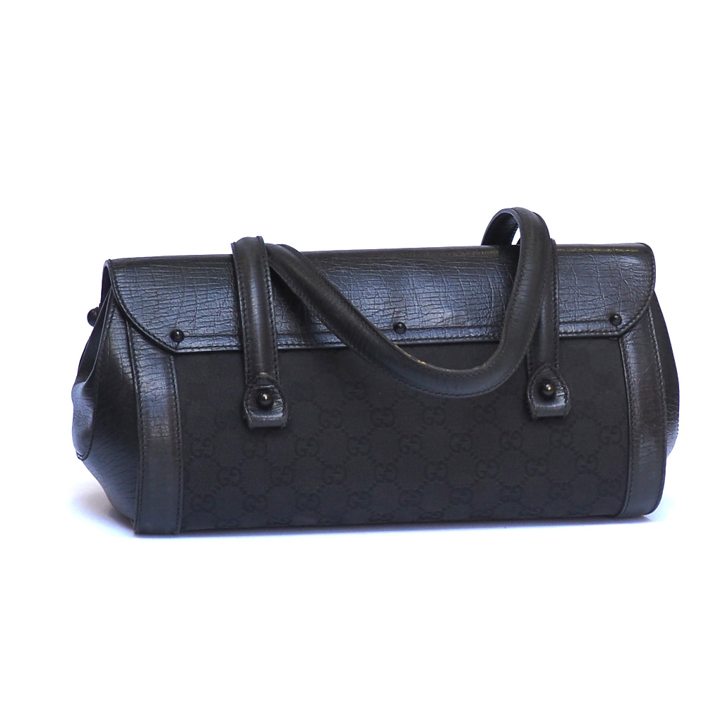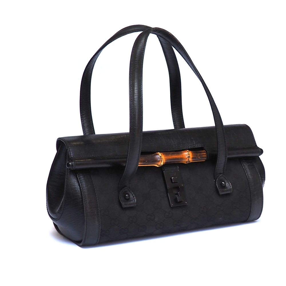 Borsa originale Gucci Bamboo in tessuto e pelle di colore nero modello Bullet; interno in tessuto nero con tasca piatta con zip.