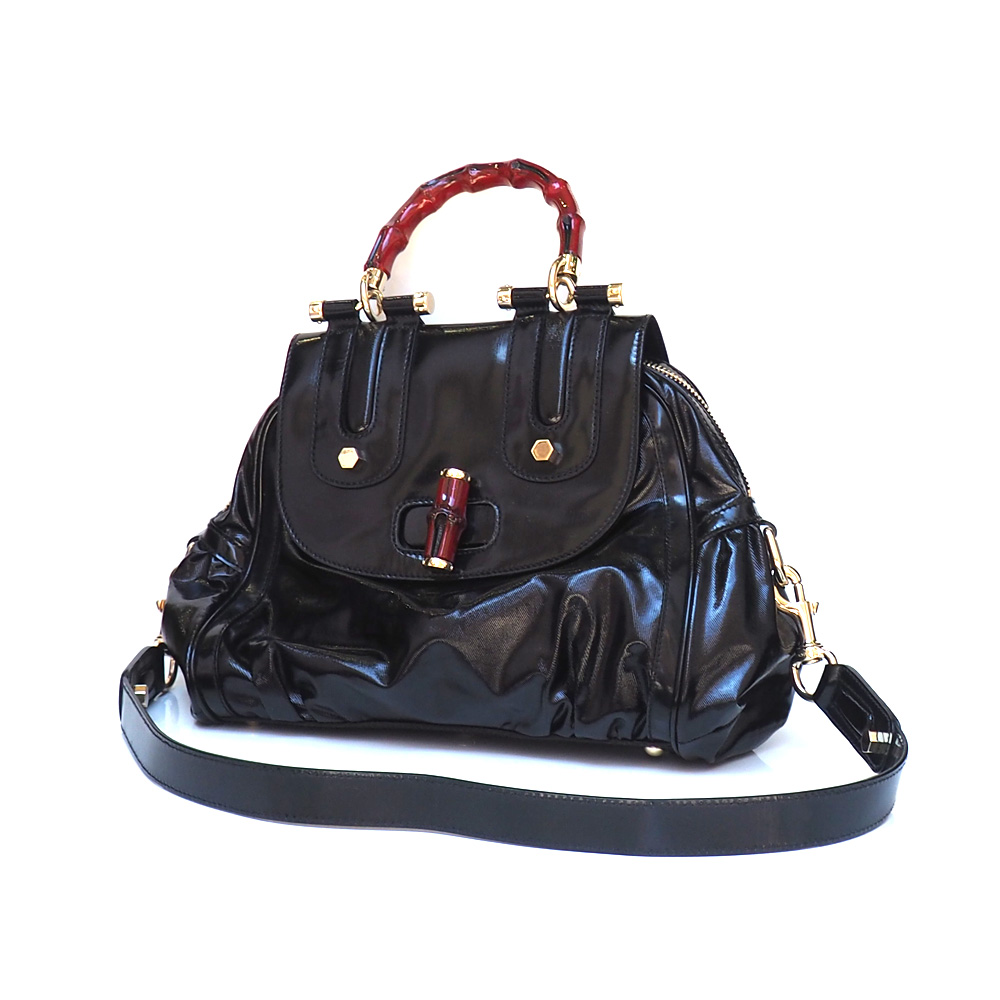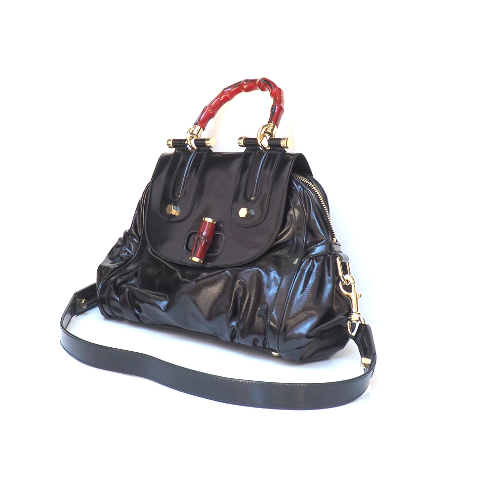 Borsa originale Gucci di colore nero con dettagli laccati rossi.