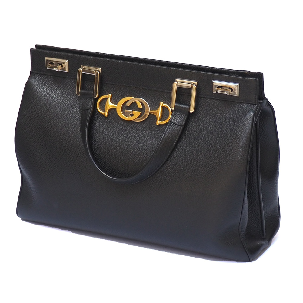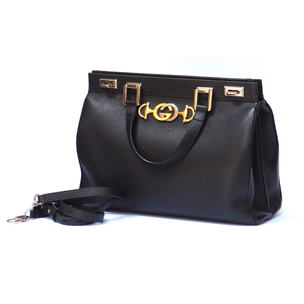 Borsa originale Gucci in pelle nera, modello Zumi con tracolla amovibile e regolabile.Interno in pelle bordeaux con ampi spazi divisi da una tasca centrale con zip e tasca piatta con cerniera; chiusura a scatto. completa di Dustbag Gucci.