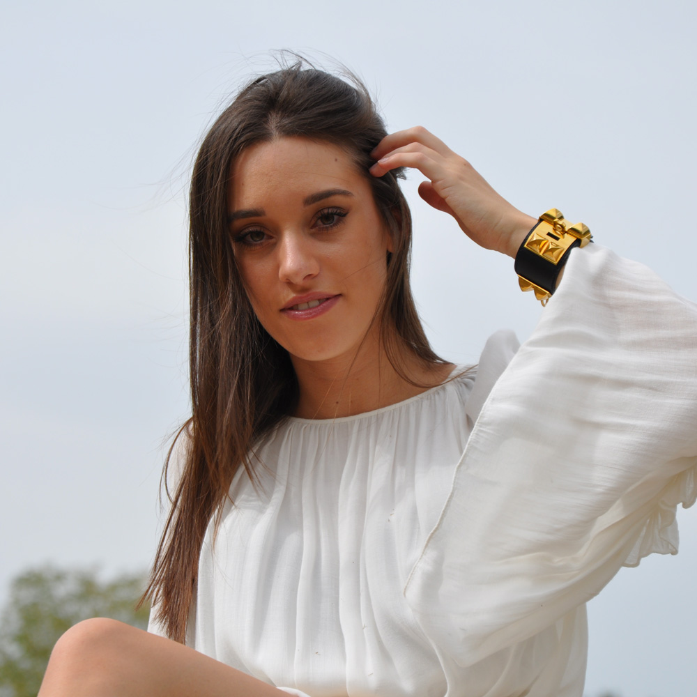 Bracciale originale Hermès Collier de Chien (Made in France, anno 1997) realizzato in pelle nera con hardware in metallo dorato. Misura 16,5 cm x 4 cm. Metallo leggermente rigato. Buone condizioni, provenienza privata.