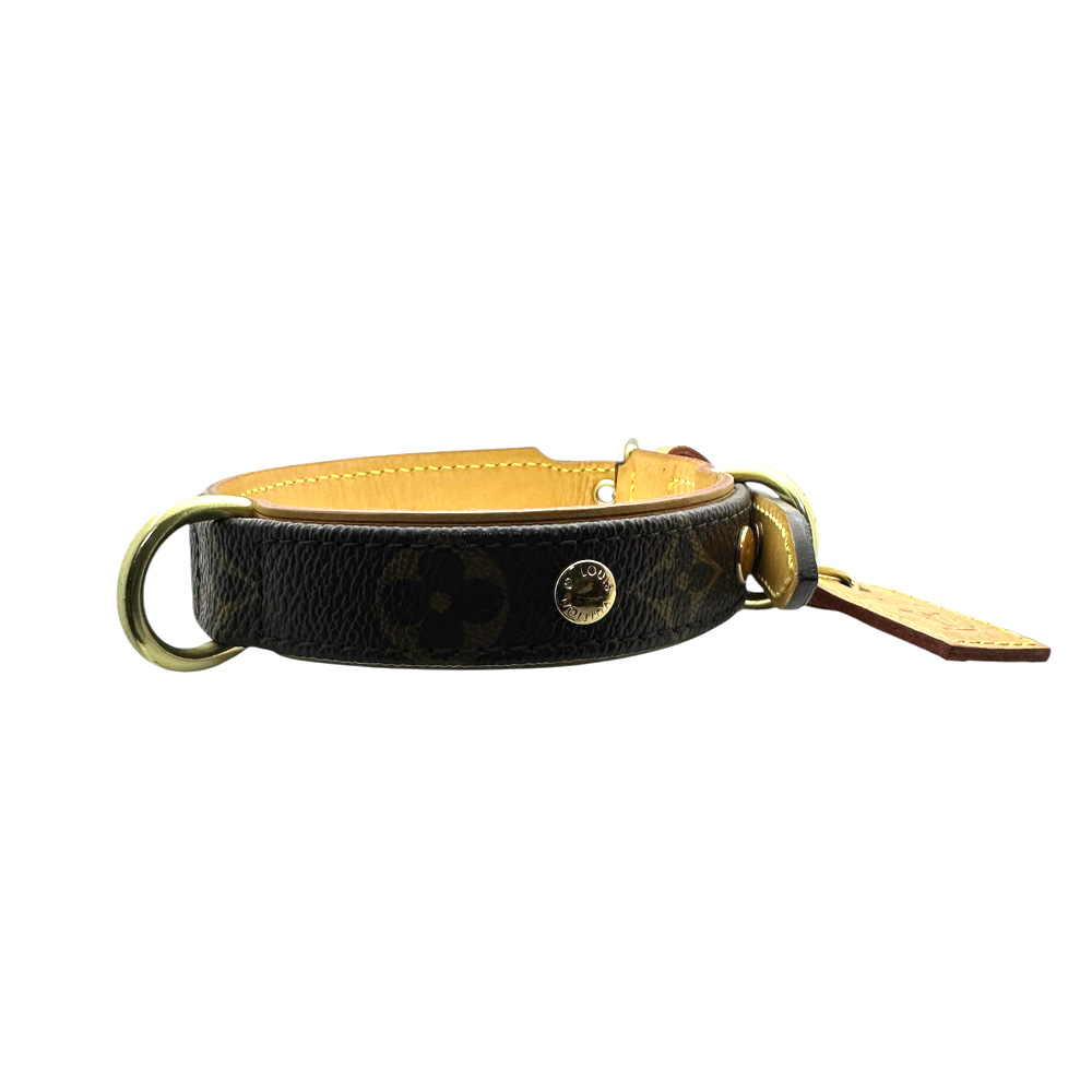 Collare originale Louis Vuitton in tela monogram e vacchetta naturale con targhetta LV dove è possibile incidere la personalizzazione, hardware color oro.