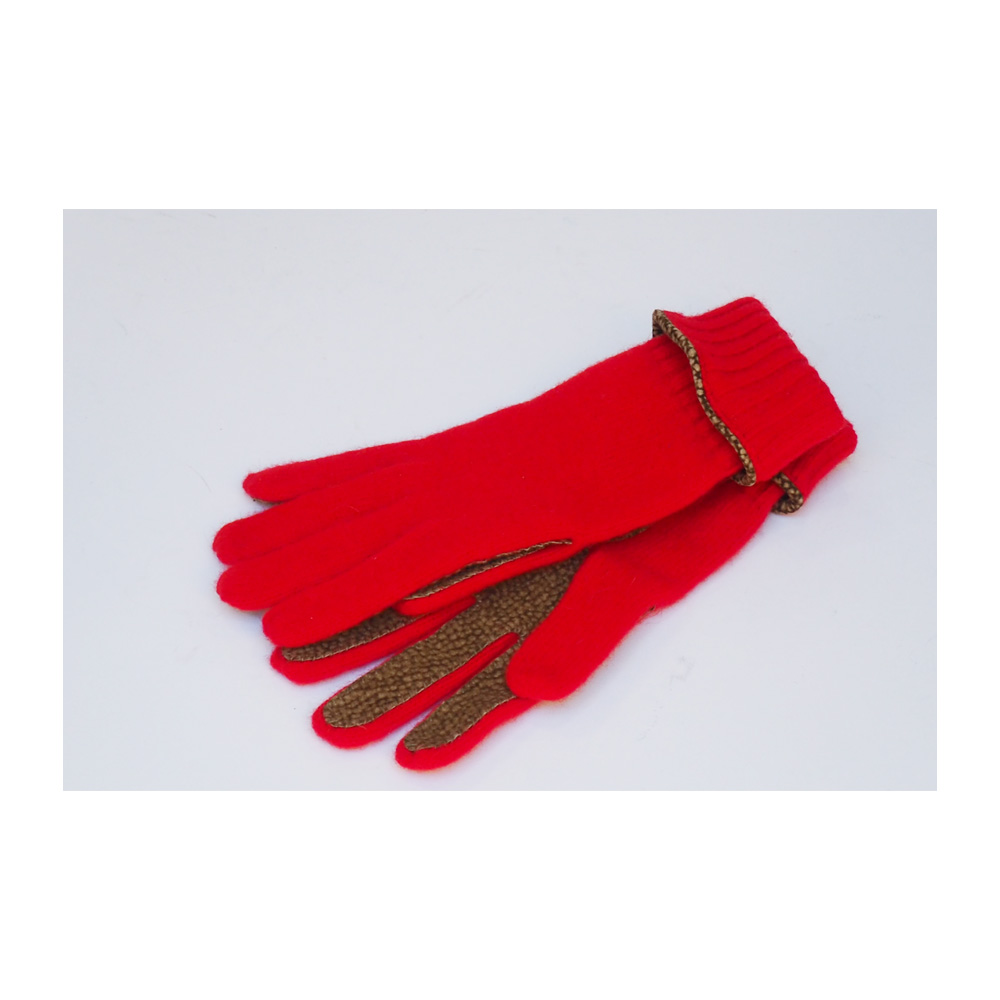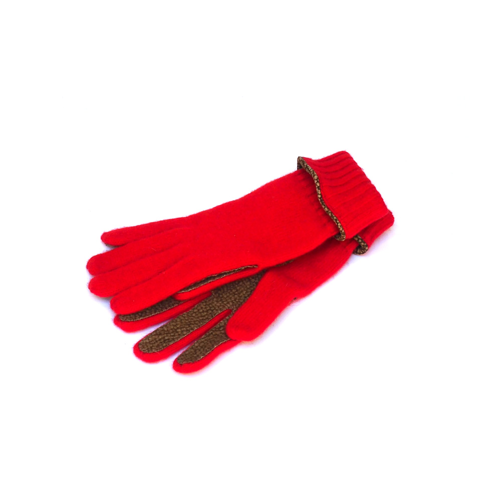 Guanti in lana e angora di colore rosso con intarsio in pelle stampa tapiro Borbonese, made in Italy.
