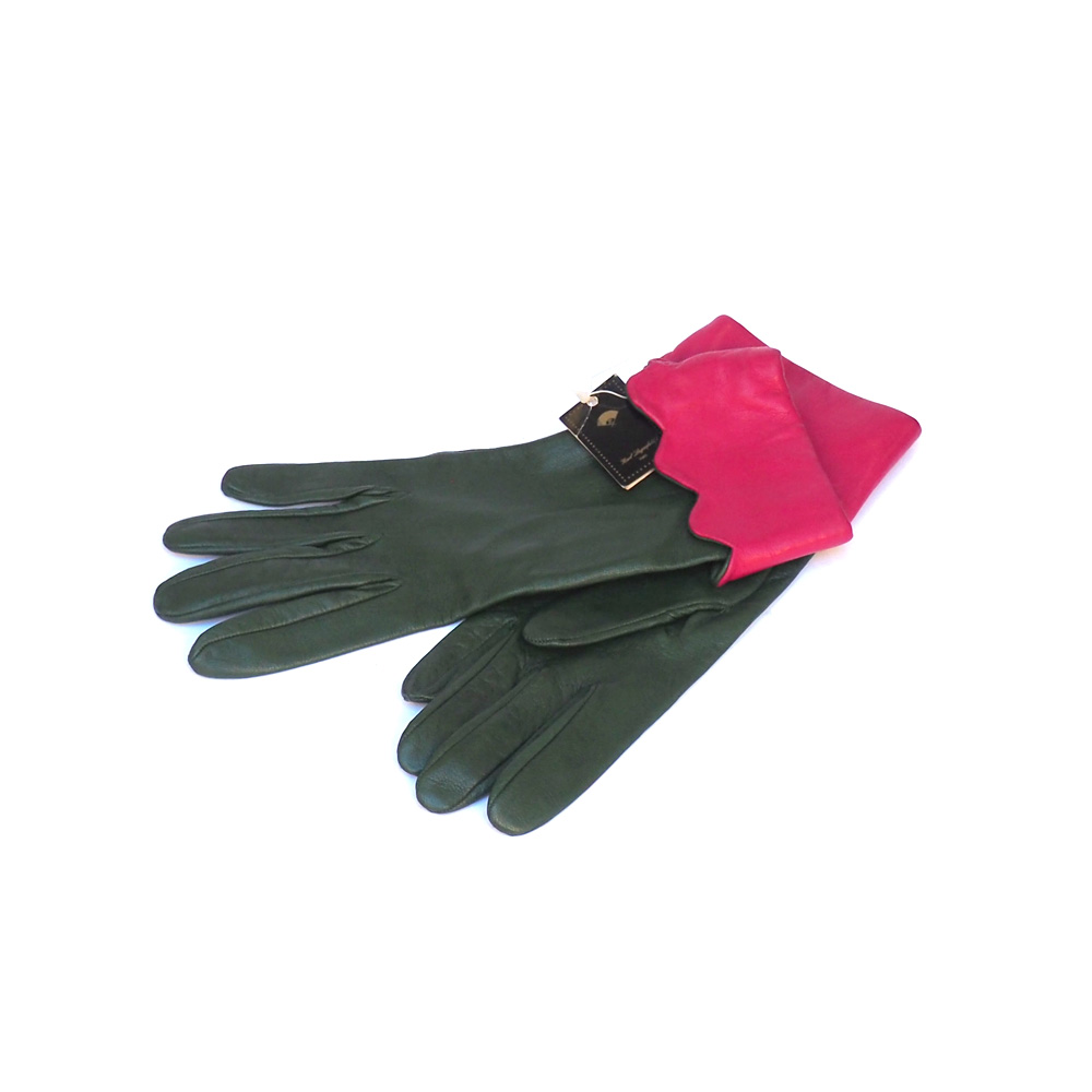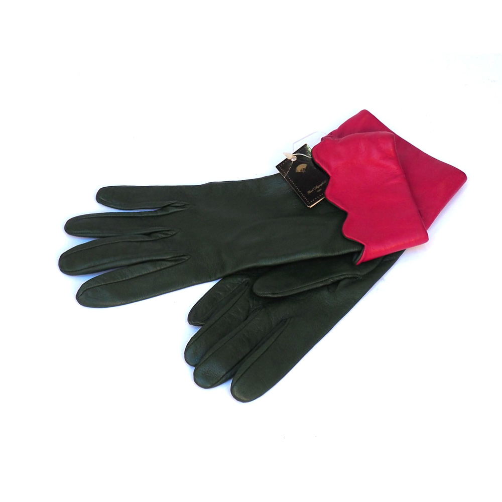 Guanti originali Karl Lagerfeld in pelle di colore verde smeraldo intenso e violaceo, interno in seta.