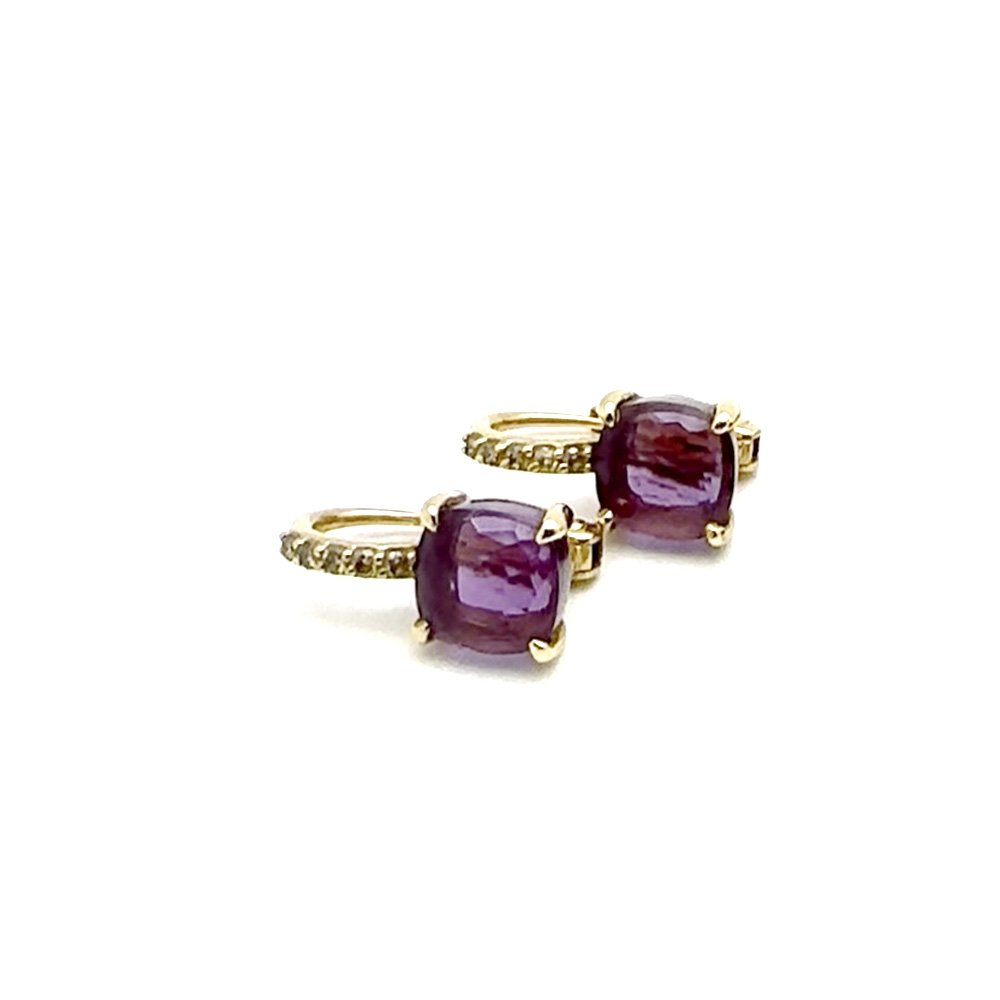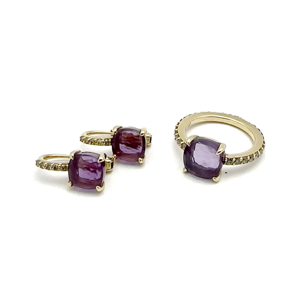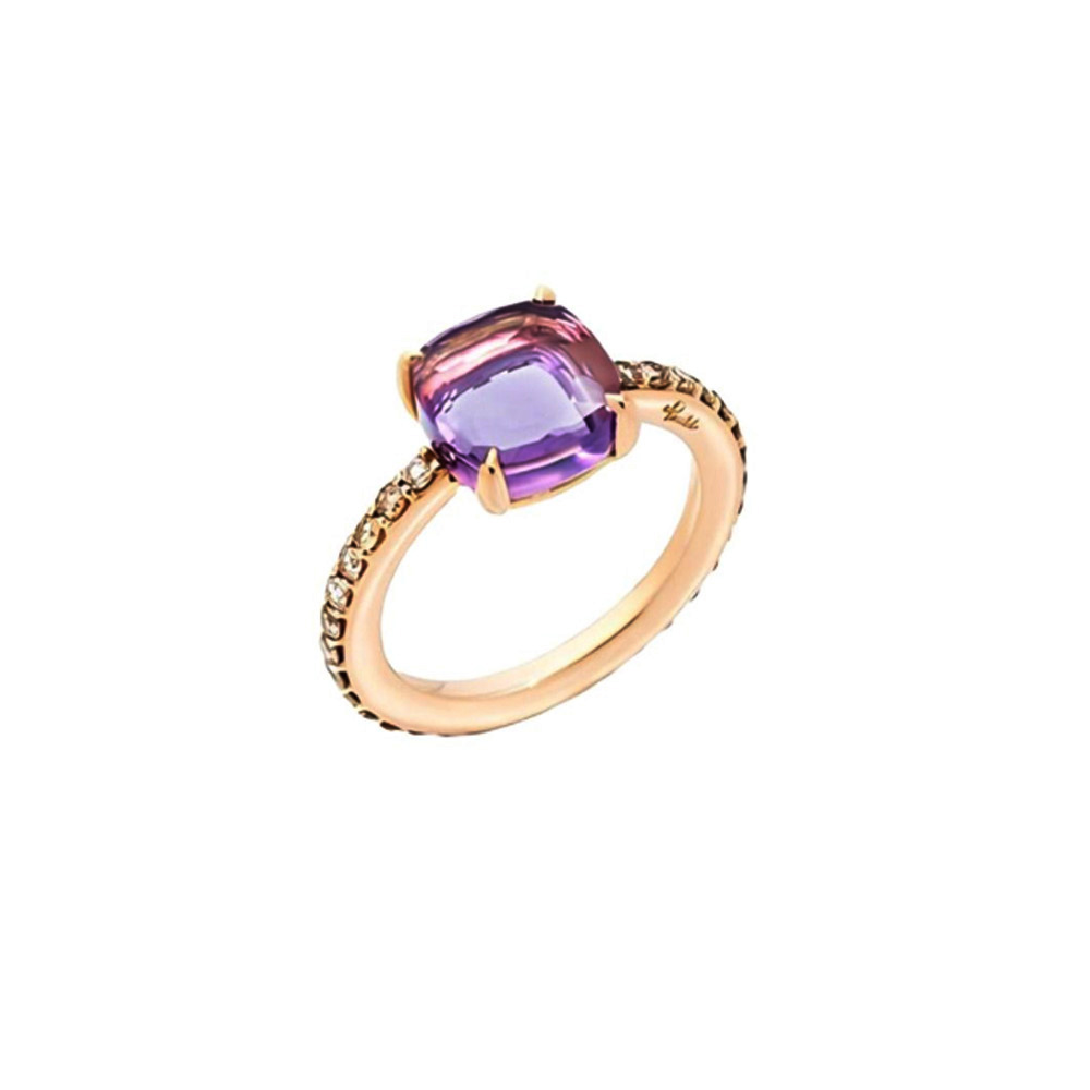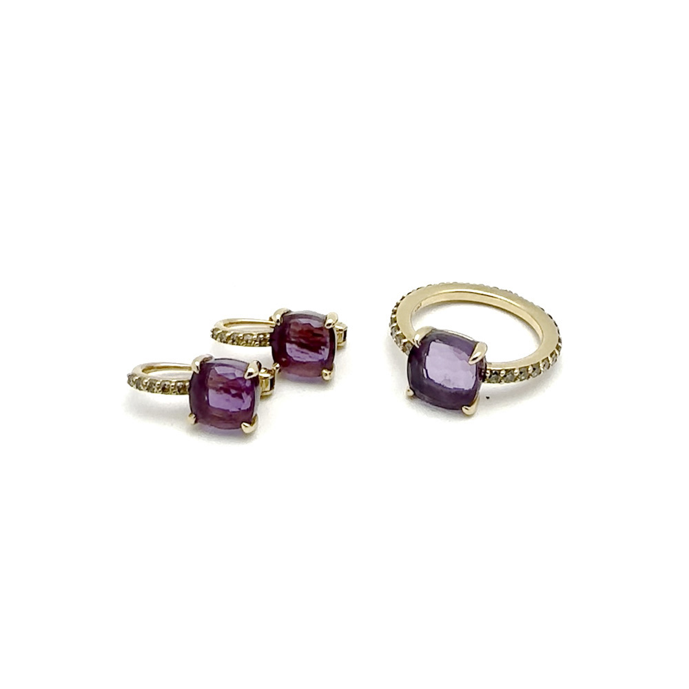Anello e Orecchini Pomellato in oro, ametista e diamanti brown; collezione Baby.