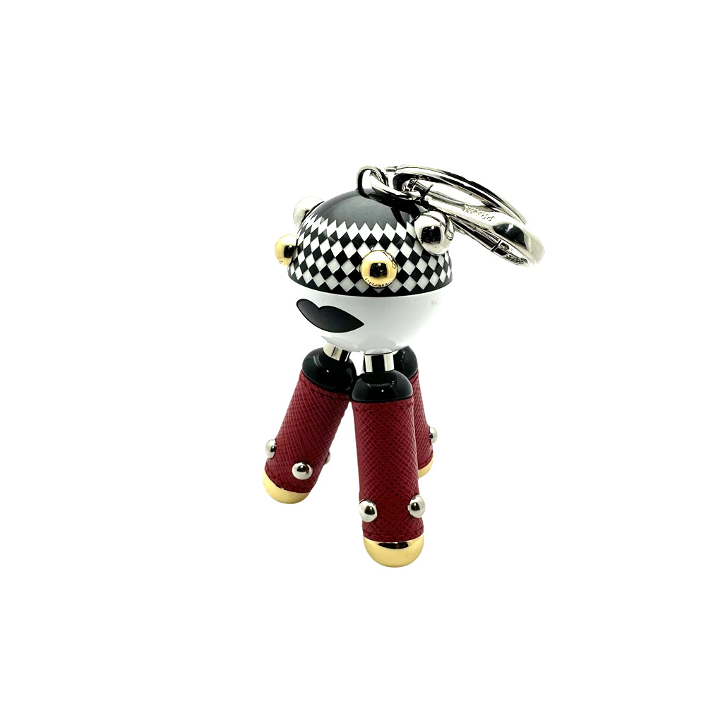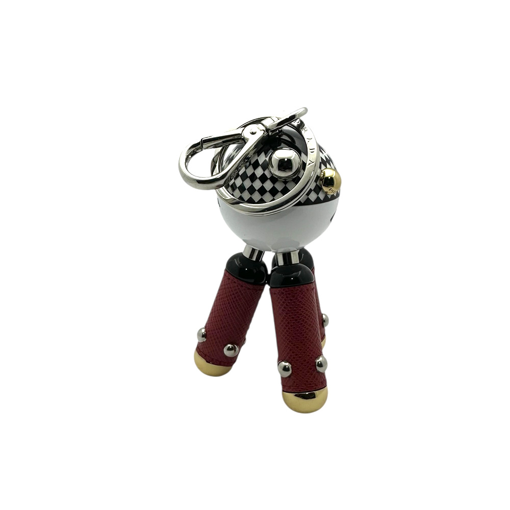 Il Charm presenta una testa a sfera con un motivo a scacchi bianchi e neri e dettagli metallici color oro, le gambe sono realizzate in pelle Saffiano rossa.