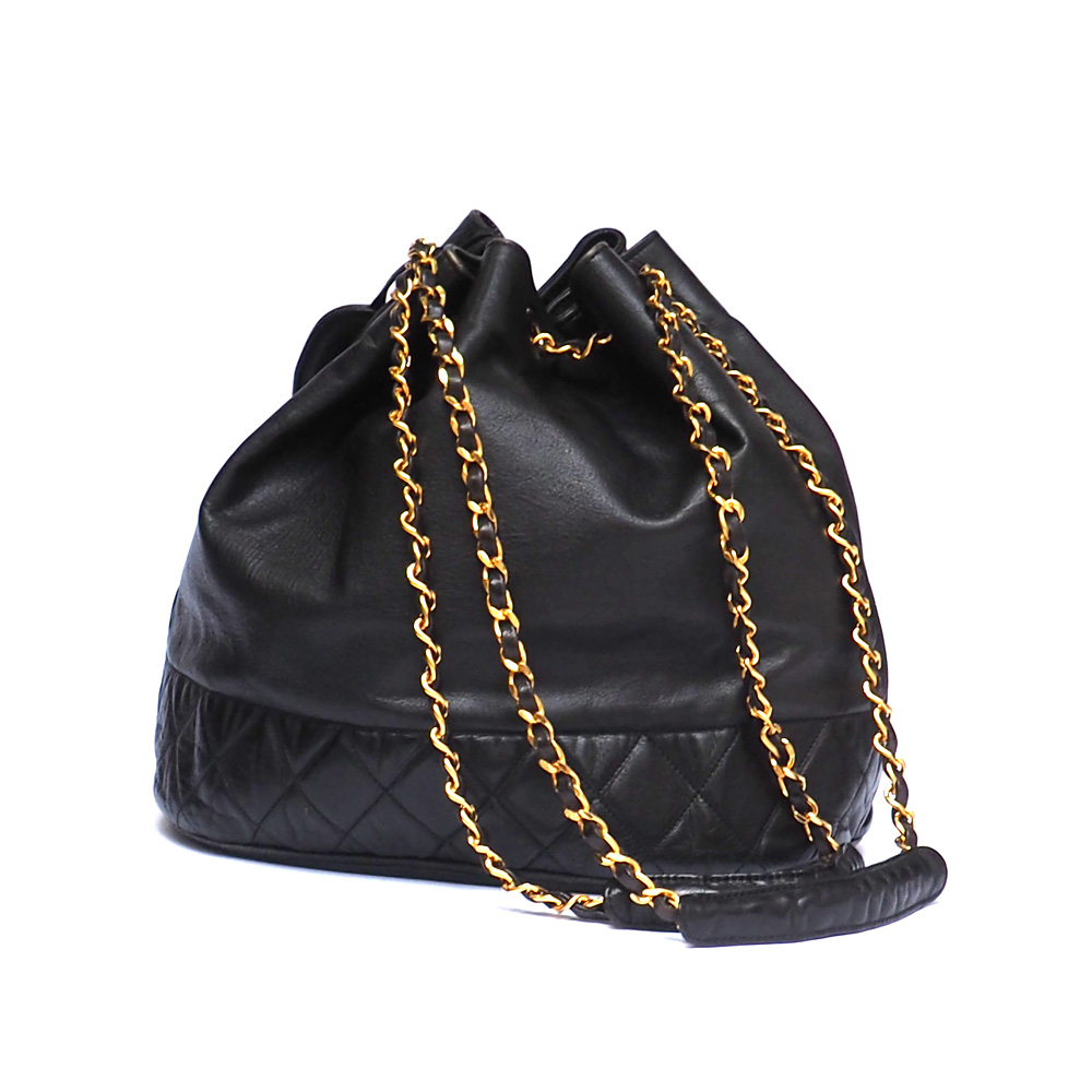 Secchiello in pelle originale Chanel di colore nero con catene color oro , made in Italy.