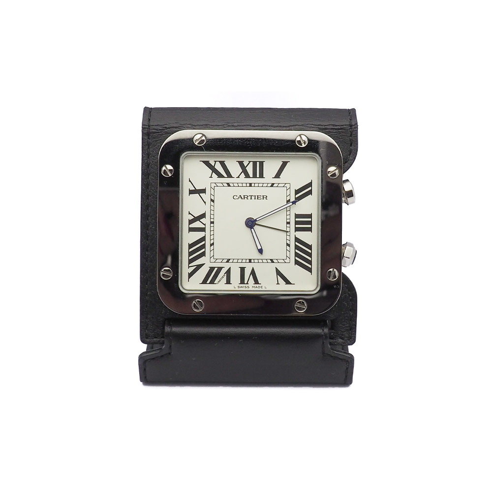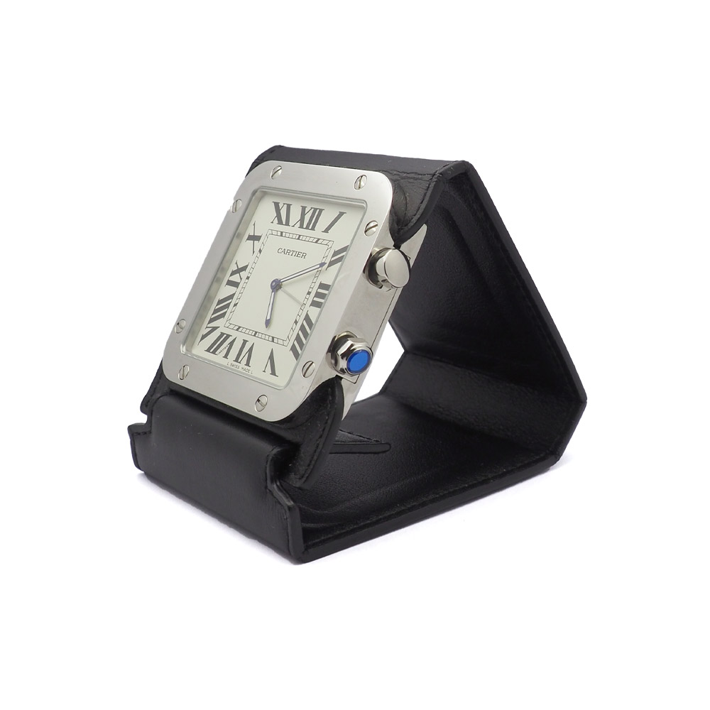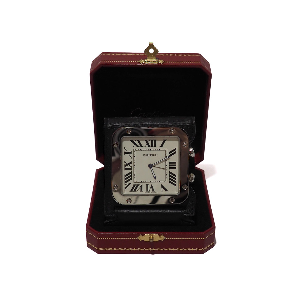 Sveglia originale da viaggio/scrivania Cartier Santos in acciaio con quadrante bianco con numeri romani neri, lancette in acciaio azzurrato e  firma “CARTIER”.